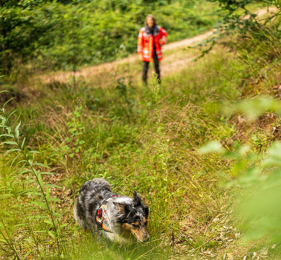Suche nach vermissten Personen in unübersichtlichem, unbebautem Gelände (z. B. Wälder, Parks). Der Hund sucht nach jedem Menschen in Not.